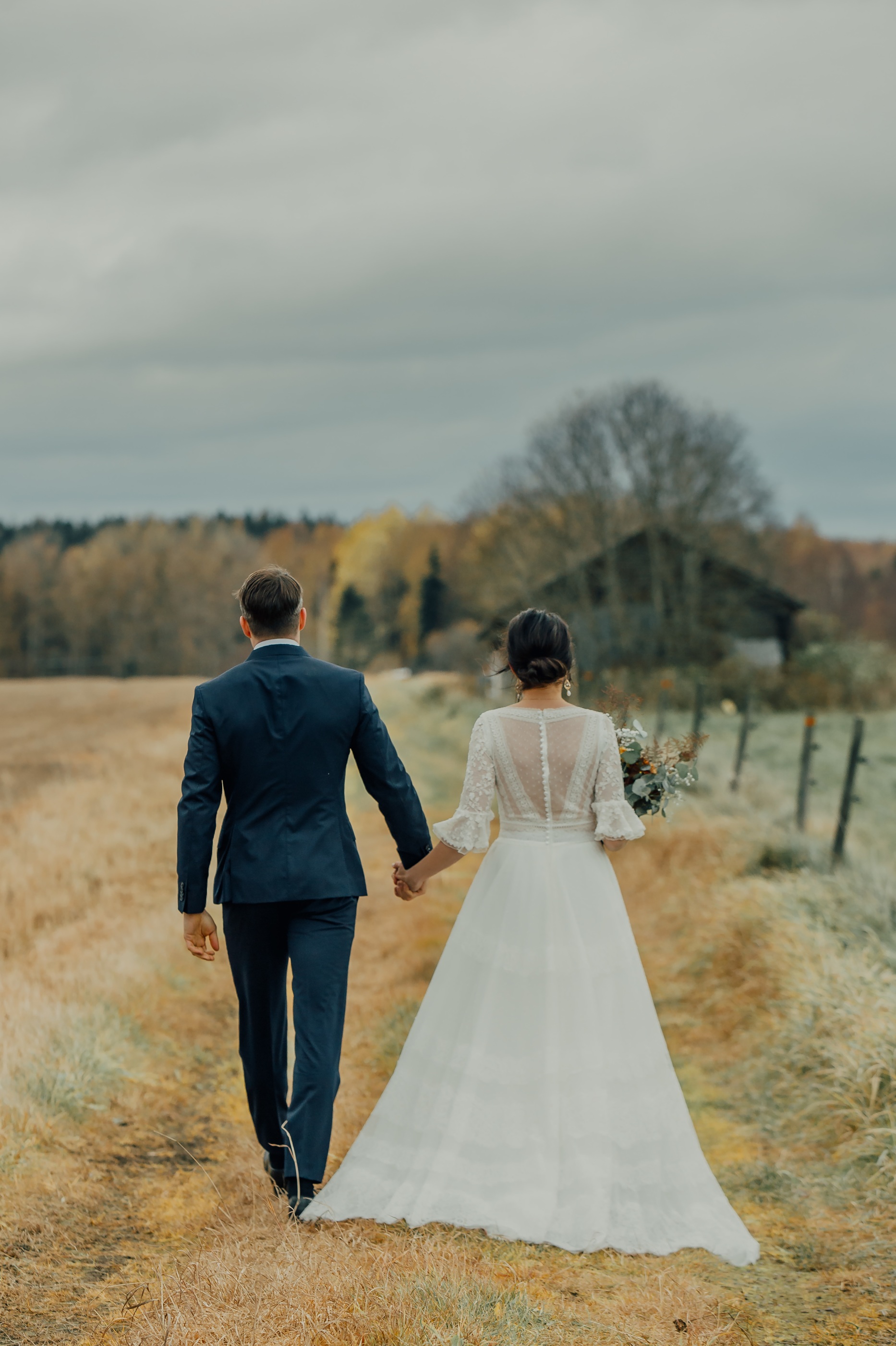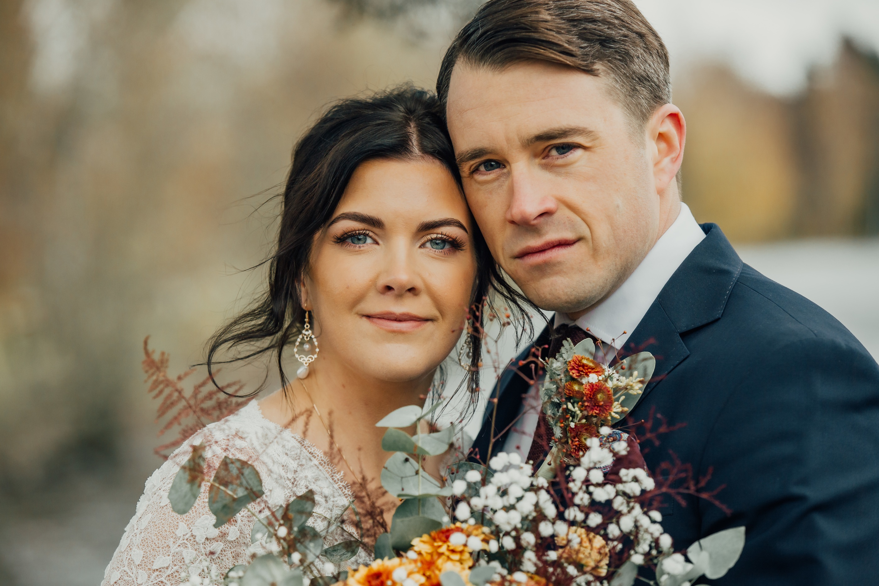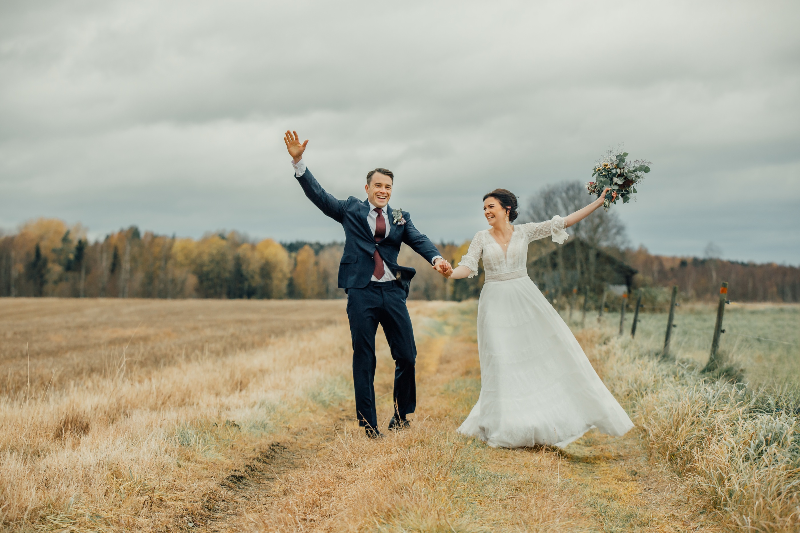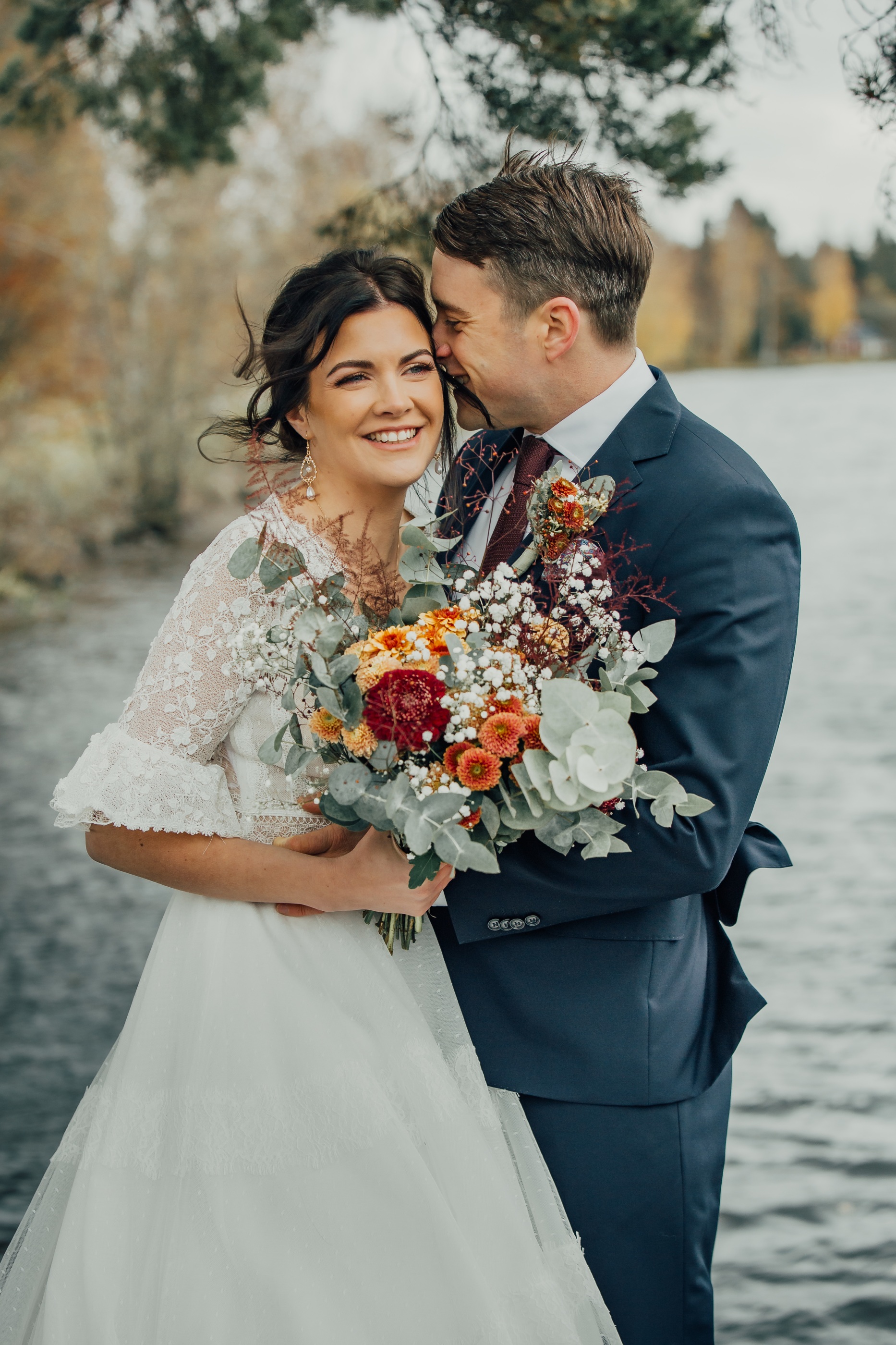Tänk när naturen slår om i en fantastisk färgprakt av gult, orange och rostrött och ha ditt bröllop just då. Bruden bukett och brudgummens korageblomma matchar så fint naturen varma fägnyanser. Dessa bilder är tagna i Torsång i Borlänge, en blåsig oktoberdag och ser ni så effektullt vindbyarna tar tag i brudens vackra klänning. Vilken årstid önskar ni att ha erat bröllop?