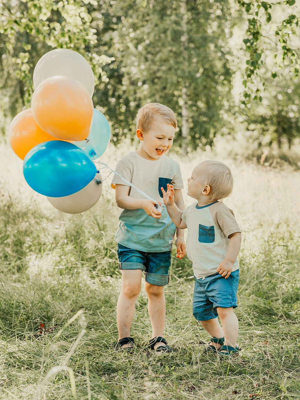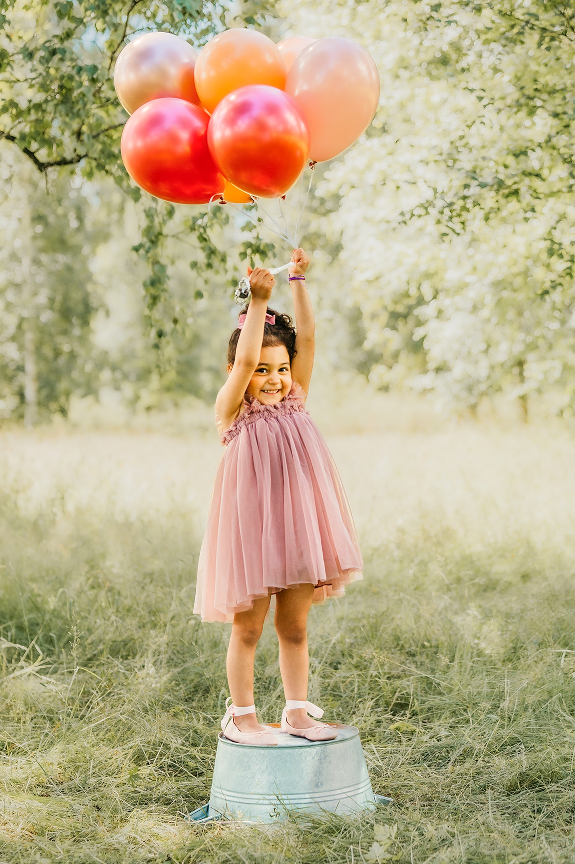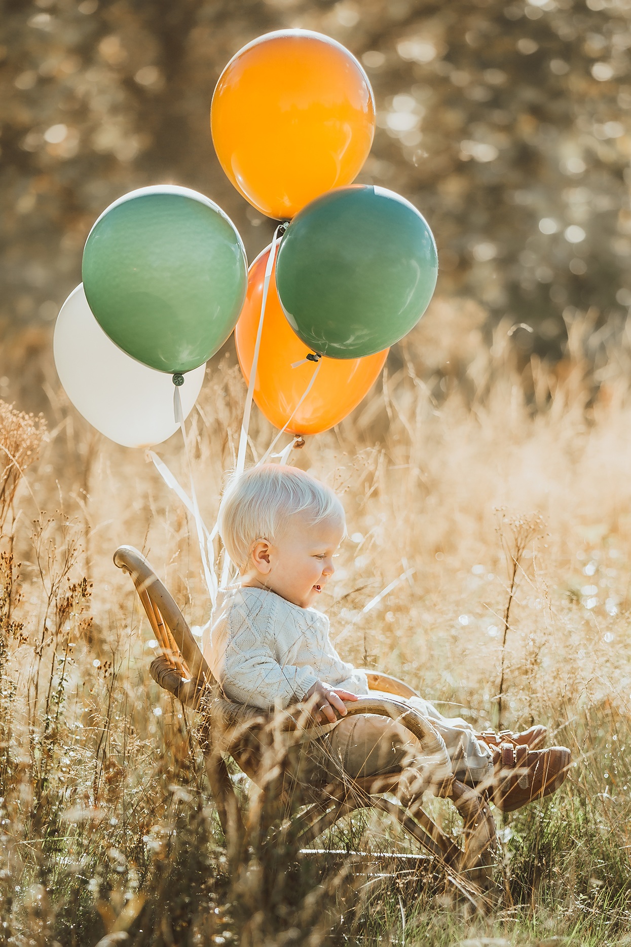 Fotograferingen sker utomhus i naturligt ljus, där miljön tillsammans med de svävande ballongerna ger en drömsk och tidlös känsla. Barnen får utforska, leka och interagera med ballongerna, vilket skapar genuina uttryck och levande bilder fulla av personlighet.